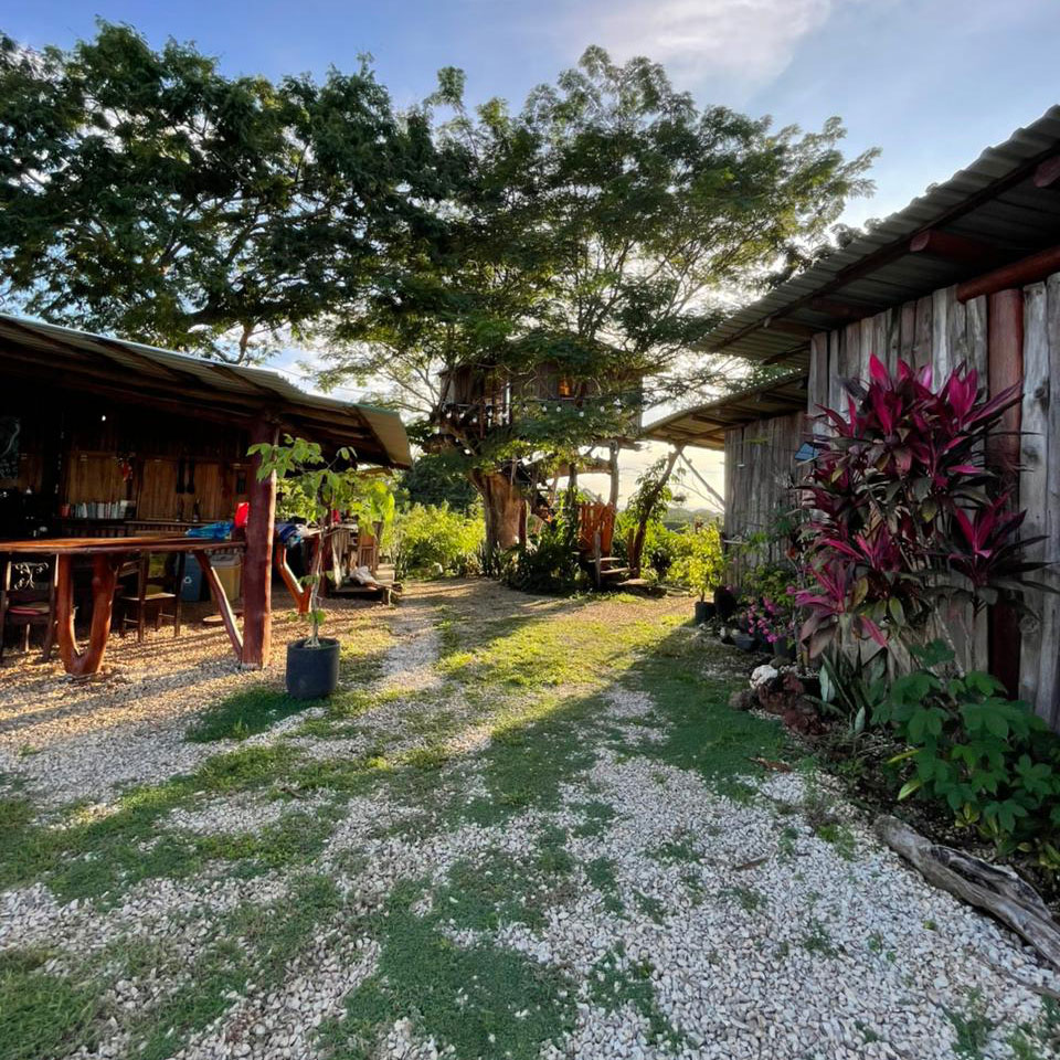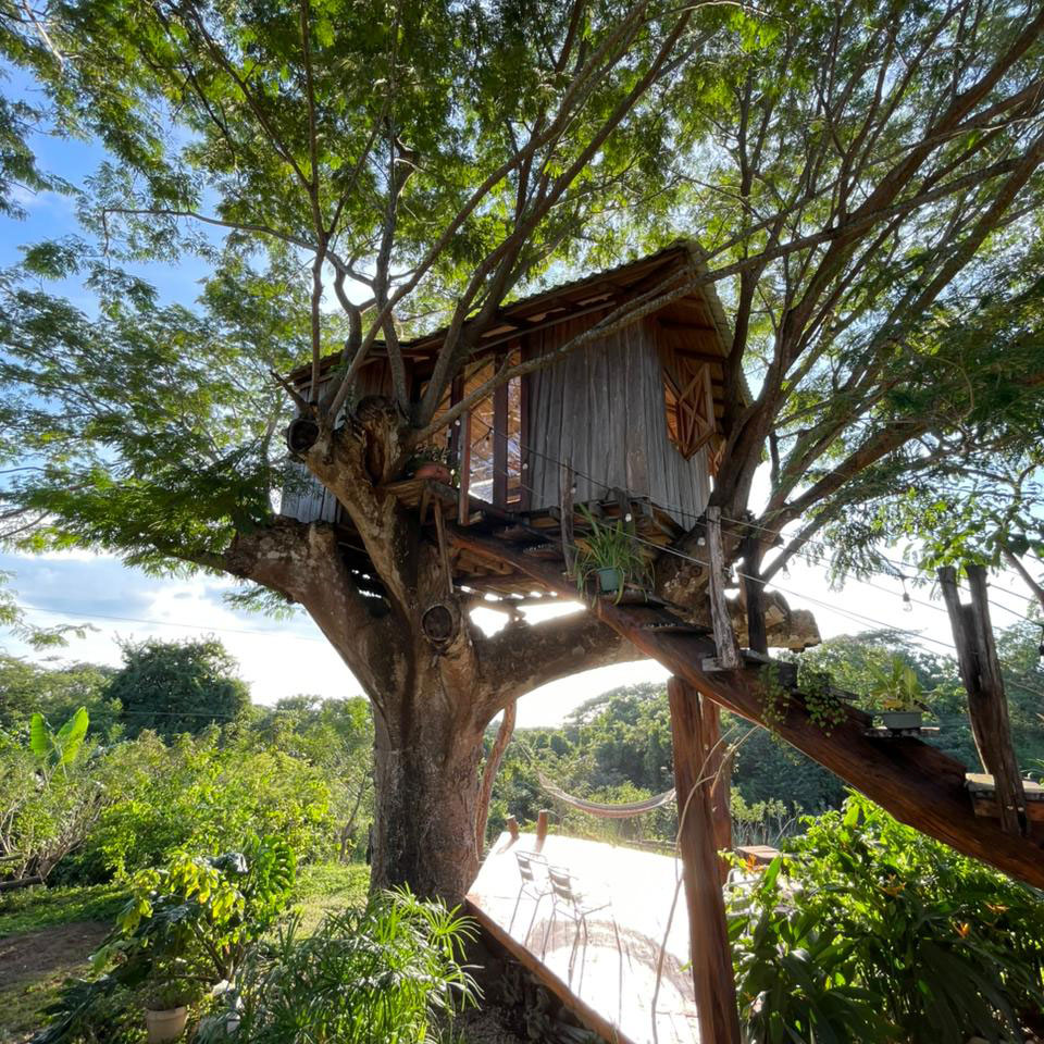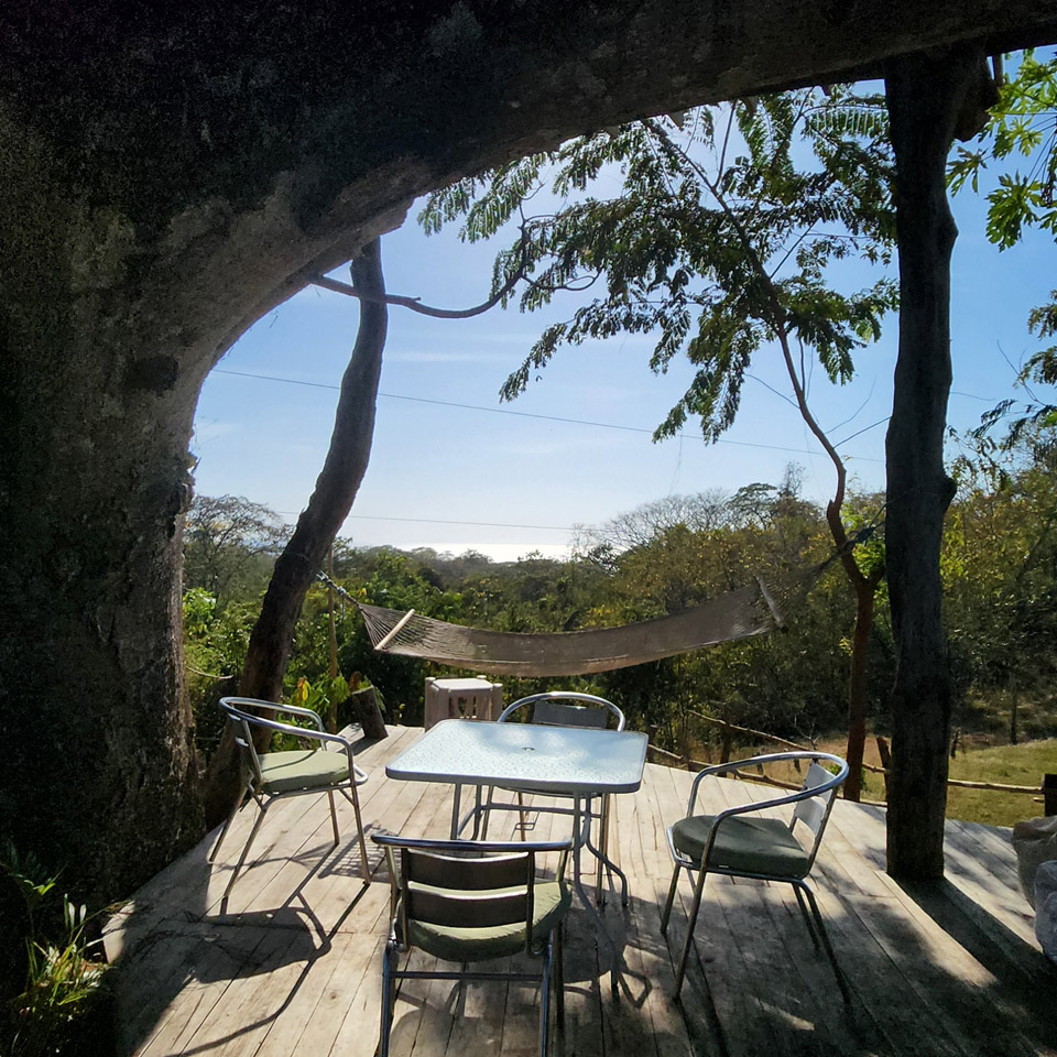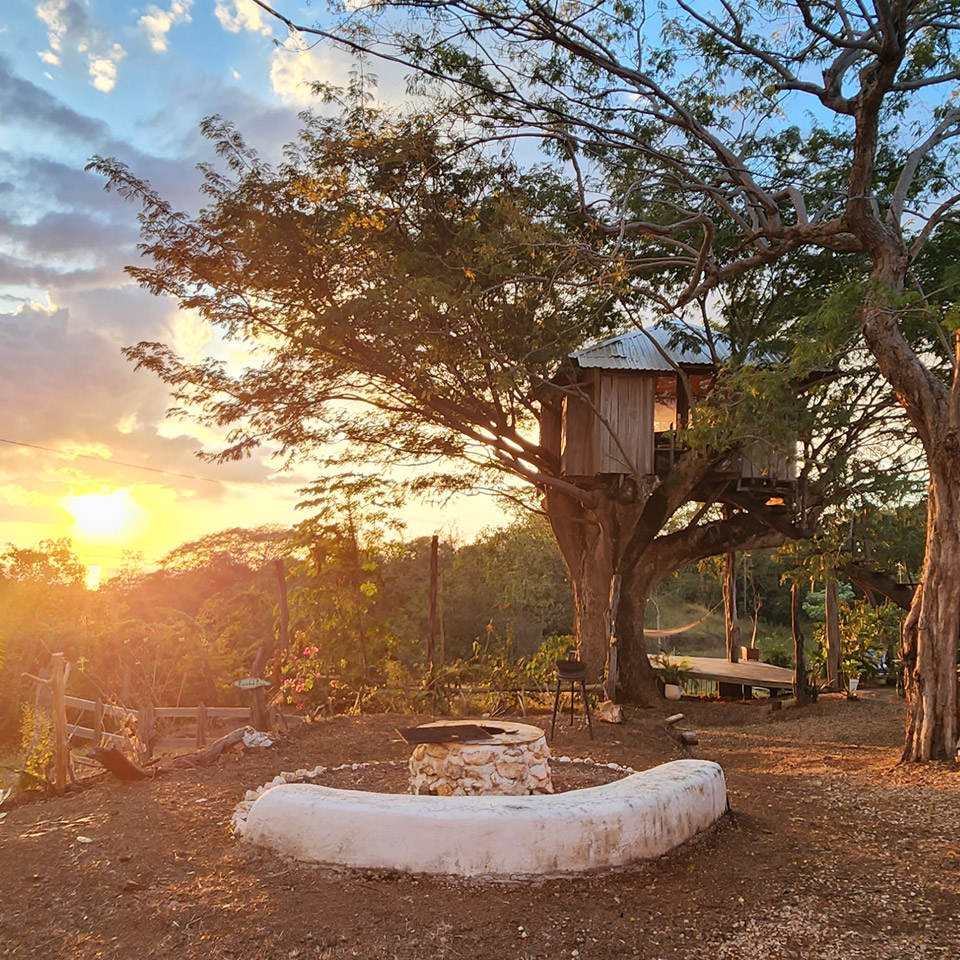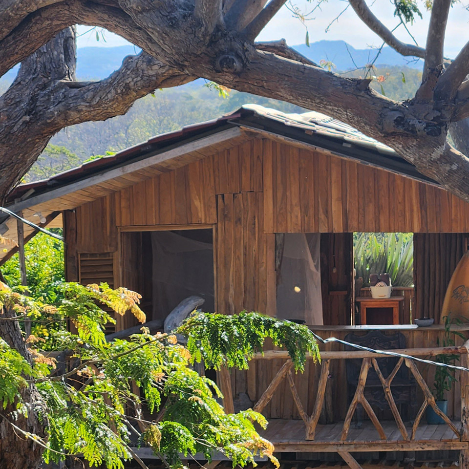 Duerme en las ramas de un viejo árbol de Guanacaste con vista al mar.