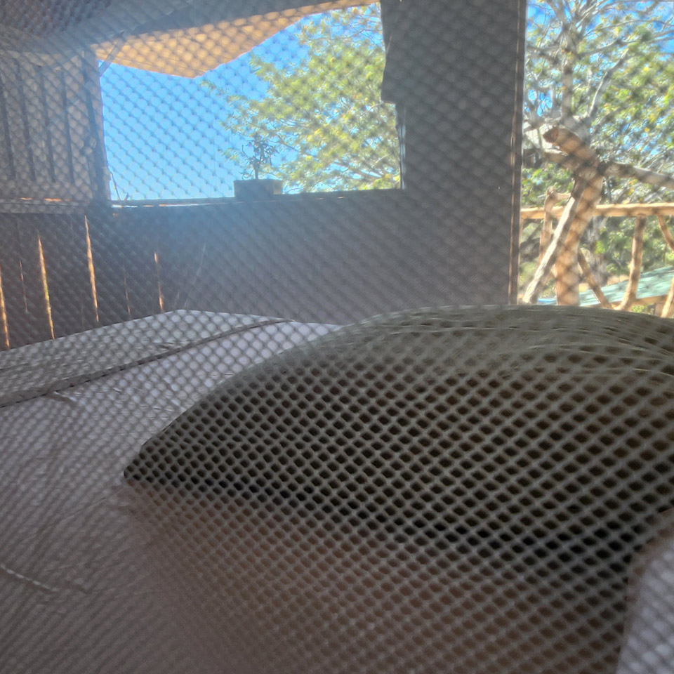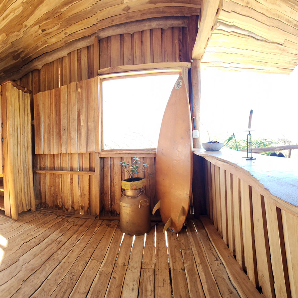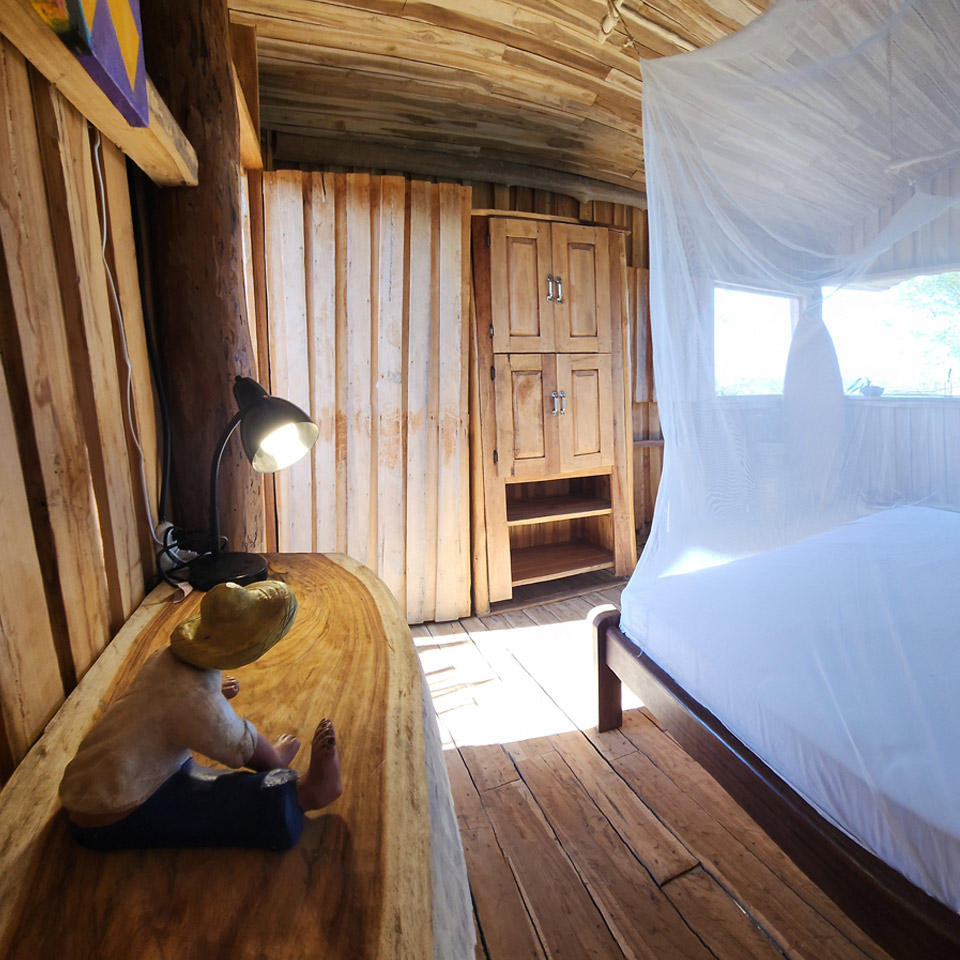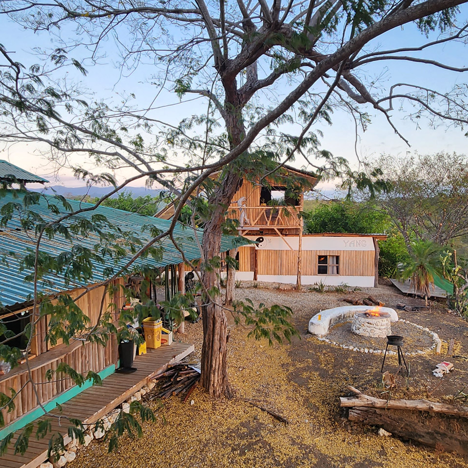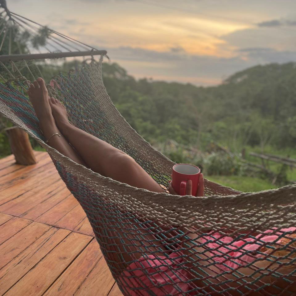 Duerme en las ramas de un viejo árbol de Guanacaste con vista al mar.